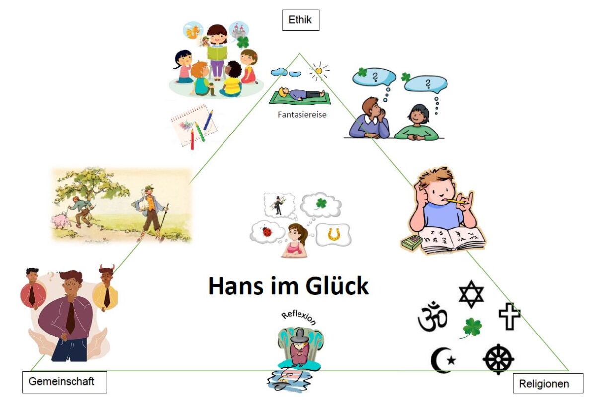 Die Geschichte «Hans im Glück» eignet sich hervorragend für den ERG-Unterricht, der die Bereiche Ethik, Religion und Gemeinschaft umfasst. Aus ethischer Sicht befasst sich das Thema Glück oft mit Fragen nach dem richtigen Handeln und den moralischen Konsequenzen unserer Entscheidungen. Es wird untersucht, wie unsere Handlungen unser eigenes Glück und das Glück anderer Menschen beeinflussen können. In religiösen Traditionen wird das Thema Glück oft in Verbindungen mit spirituellem Wohlstand und der Beziehung zu Gott betrachtet. Glück wird nicht nur als materieller Wohlstand gesehen, sondern auch als innerer Frieden und Erfüllung im Glauben. Religionen können unterschiedliche Ansichten darüber haben, wie man wahres Glück erreicht.